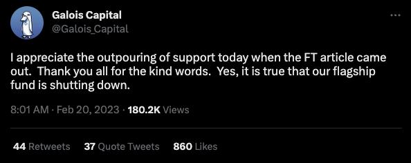 Galois Capital co-founder Kevin Zhou wrote in documents seen by the Financial Times that it was no longer viable to continue running the fund, and that he was sorry about the situation. Galois Capital confirmed the shutdown on Twitter, saying that it had managed to maintain a positive performance since inception, despite the losses from the FTX disaster. The remaining funds will be returned to investors, with 90% of the money not trapped on FTX being released immediately. The remaining 10% will be temporarily held back until discussions with administrators and auditors are concluded.